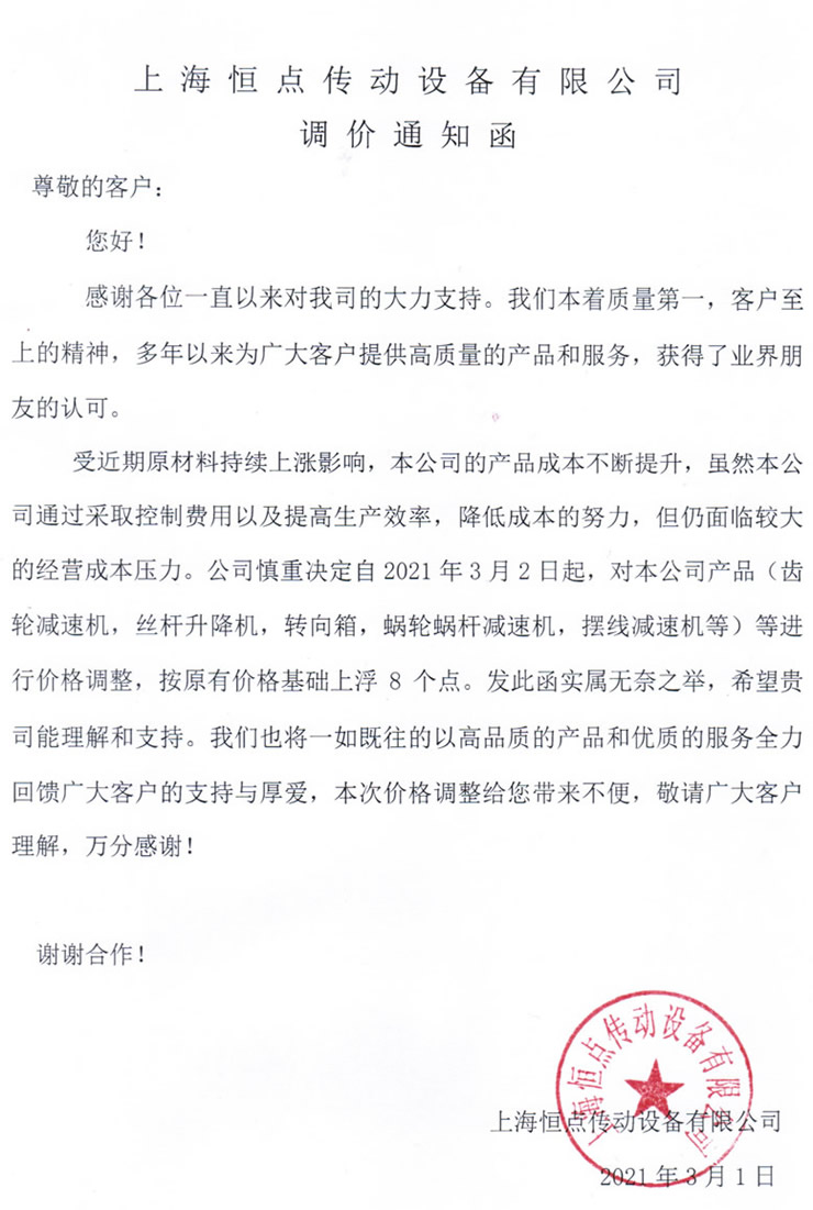 受近期原材料持續上漲影響,本公司的産品成本不斷提升,雖然本公司通過採(cǎi)取控制費用以及提高生産效率,降低成本的努力 ,但仍面臨較大的經營成本壓力。公司慎重決定自2021年3月2日起,對本公司産品(齒輪減速機,絲杆升降機,轉向箱,蝸輪蝸杆減速機,擺線減速機等)等進行價格調整,按原有價格基礎上浮8個點。發此函實屬無奈之舉,希望貴司能理解和支持。我們也将一如既往的以高品質的産品和優質的服務全力回饋廣大客戶的支持與厚愛(ài),本次價格調整給您帶來不便,敬請廣大客戶理解,萬分感謝!