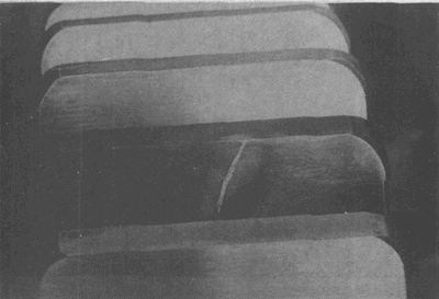 在大齒輪齒頂形成的淬火裂紋(這種裂紋通常都在這個區域出現)。