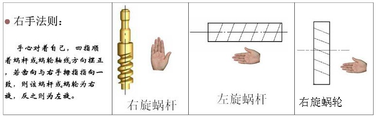 蝸輪蝸杆旋向是蝸輪蝸杆傳動的基本參數,分左旋和右旋,主要區别在於蝸輪蝸杆的旋轉方向,其中右旋蝸杆最爲常見,一副蝸輪蝸杆旋向的判斷方法可根據右手法則確認: