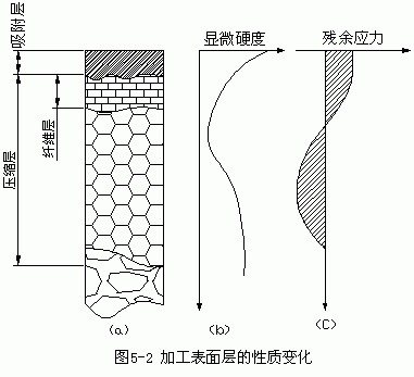 表面層的物理力學性能包括表面層的加工硬化、殘餘應力和表面層的金相組織變化。機械零件在加工中由於受切削力和熱的綜合作用,表面層金屬的物理力學性能相對於基本金屬的物理力學性能發生瞭(le)變化。圖 5— 2a所示爲零件表面層沿深度方向的變化。最外層生成有氧化膜或其他化合物,並(bìng)吸收、滲進氣體粒子 ,稱爲吸附層。吸附層下是壓縮層,它是由於切削力的作用造成的塑性變形區,其上部是由於刀具的擠壓摩擦而産生的纖維層。切削熱的作用也會使工件表面層材料産生相變及晶粒大小變化。
