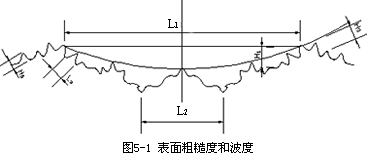 加工表面的微觀幾何特征主要包括表面粗糙度和表面波度兩部分組成,如圖 5— 1所示 。表面粗糙度是波距 L小於(yú) 1mm的表面微小波紋;表面波度是指波距 L在 1~ 20mm之間的表面波紋。通常情況下,當(dāng) L/H(波距 /波高)﹤ 50時爲表面粗糙度, L/H=50~ 1000時爲表面波度。
