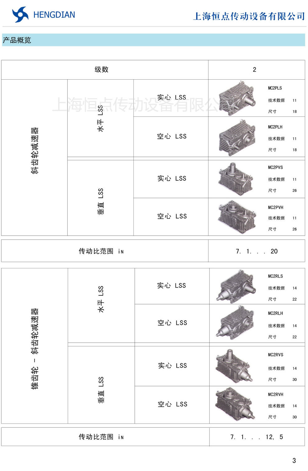 9 - 傳動能力和外型安裝尺寸/斜齒豎立安裝 10 - 傳動能力和外型安裝尺寸/錐齒-斜齒水平安裝