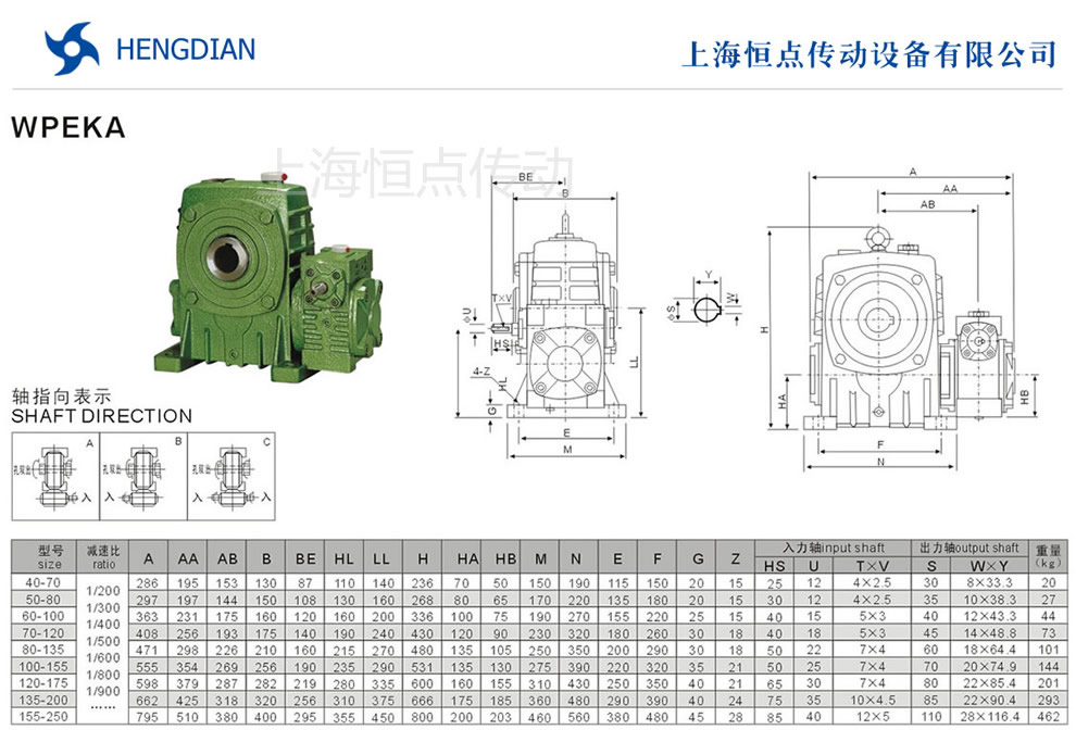 WPEKA雙級減速機的外形安裝尺寸.WPEKA雙級蝸輪蝸杆減速機選型指南,WPEKA雙級減速機軸輸入,孔輸出.WPEKA雙級減速機軸指向表示方法.機座号40-70到155-250,速比200到900.